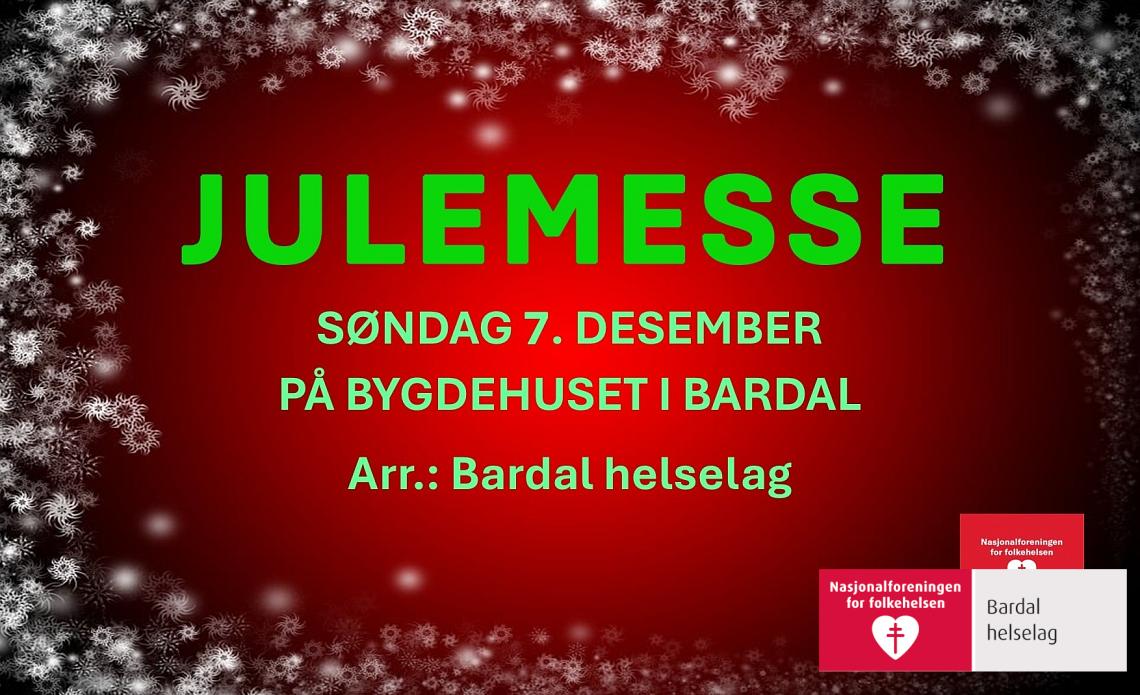 Hvem: Bardal Helselag Tid: søndag 07. des - 13:00 Sted: Bardal bygdehus Komite: Ingen ennå Informasjon om arrangementet Helselagets julemesse. Mer informasjon kommer.